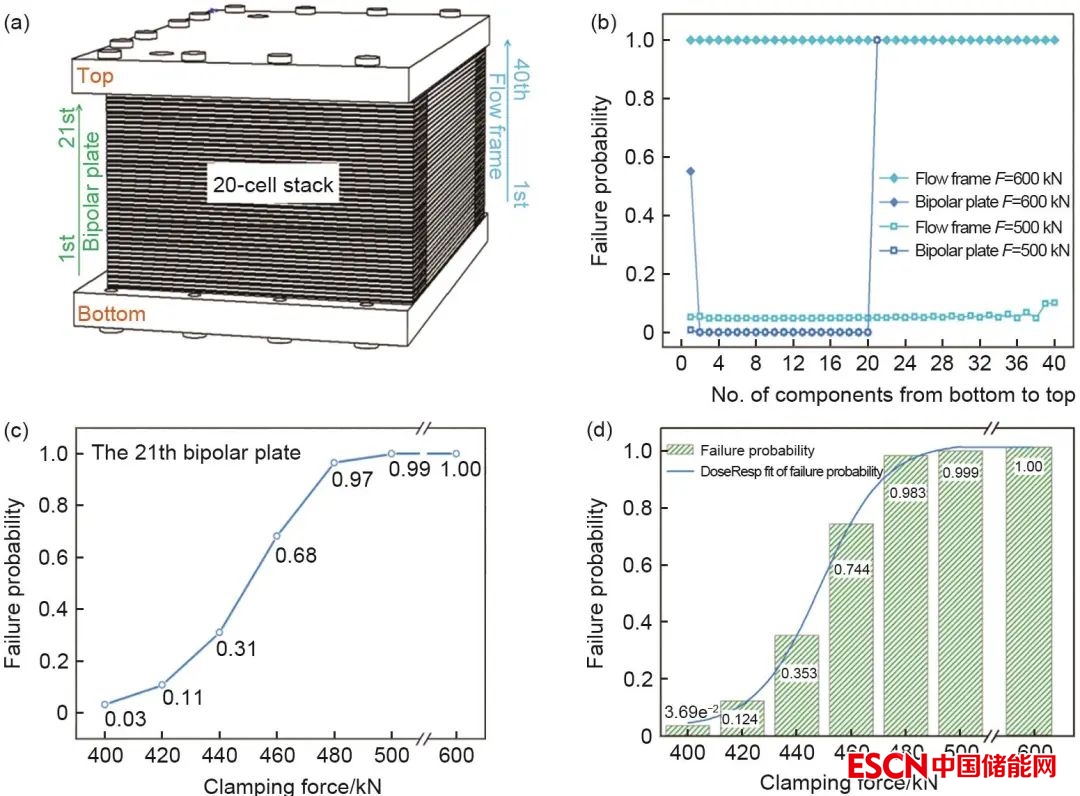 在此基礎(chǔ)上,Xiong等進(jìn)一步利用數(shù)值仿真方法,針對(duì)單體電堆提出了基于Weibull分布特性的量化失效概率的評(píng)價(jià)方法,可實(shí)現(xiàn)特定結(jié)構(gòu)電堆在不同裝配力下失效概率的計(jì)算與評(píng)估。研究首先對(duì)電堆中容易發(fā)生機(jī)械失效的雙極板和導(dǎo)流板進(jìn)行了力學(xué)性能測(cè)試,獲得了其相關(guān)的力學(xué)性能參數(shù),在此基礎(chǔ)上引入Weibull統(tǒng)計(jì)理論,利用測(cè)試得到的關(guān)鍵組件的Weibull參數(shù)對(duì)電堆進(jìn)行了機(jī)械失效統(tǒng)計(jì)分析,獲得了電堆的機(jī)械失效概率;此外,研究還對(duì)比了20組電池電堆中間加厚板和不加厚板兩種結(jié)構(gòu)設(shè)計(jì),通過Weibull統(tǒng)計(jì)理論計(jì)算了兩種電池堆的機(jī)械失效概率,得到了最優(yōu)的電池結(jié)構(gòu)設(shè)計(jì)(圖6)。電堆的力學(xué)狀態(tài)不僅影響電池中各組件的機(jī)械行為以及電堆的失效概率,也會(huì)對(duì)電池內(nèi)部的電化學(xué)反應(yīng)特性產(chǎn)生影響,進(jìn)而影響電池的電化學(xué)性能。為了進(jìn)一步研究電池的力學(xué)狀態(tài)對(duì)電化學(xué)特性的影響,Xiong等對(duì)單電堆建立了力學(xué)與電化學(xué)耦合模型,系統(tǒng)分析了不同裝配力對(duì)電池的電化學(xué)特性如歐姆極化、活化極化以及濃差極化的影響,研究了不同裝配力對(duì)電池的電壓以及功率密度的影響機(jī)制,并將電化學(xué)特性與機(jī)械失效概率進(jìn)行綜合對(duì)比,揭示電池的力學(xué)狀態(tài)對(duì)電池的電化學(xué)性能和機(jī)械失效概率的交互影響作用,進(jìn)而提出了最優(yōu)的裝配力參數(shù),使電池可同時(shí)獲得最佳的電化學(xué)性能和最低的失效概率。