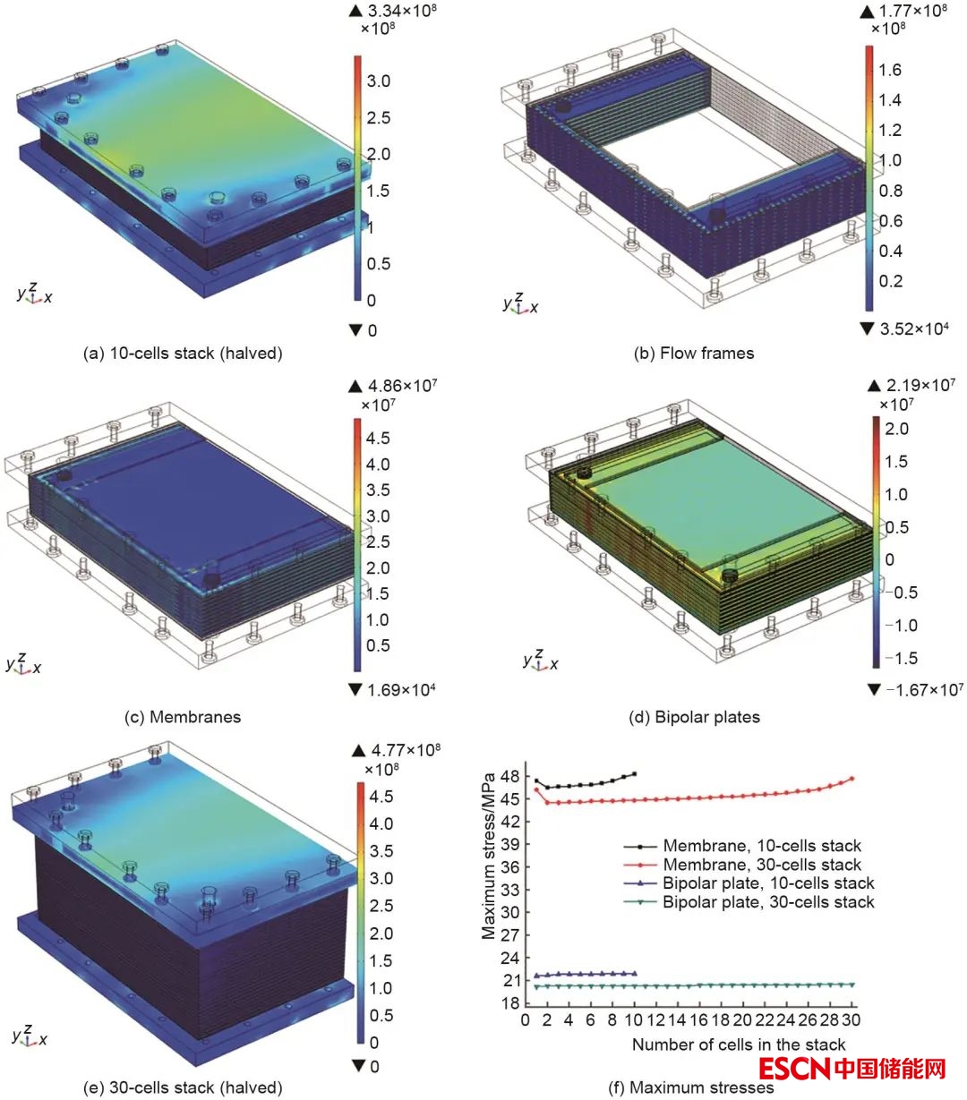 高功率電堆的設(shè)計(jì)開發(fā)不僅需要優(yōu)化流場(chǎng)設(shè)計(jì),還需要考慮電堆裝配的力學(xué)特性和各關(guān)鍵材料的受力情況。在高功率電堆的裝配過程中,不當(dāng)?shù)难b配應(yīng)力可引起材料結(jié)構(gòu)變形影響功能性甚至導(dǎo)致材料力學(xué)失效,如引發(fā)雙極板或者導(dǎo)流板的開裂、隔膜的變薄褶皺甚至撕裂、密封墊的失彈等問題,導(dǎo)致電堆性能下降、壽命縮短和漏液。絕大多數(shù)電堆在設(shè)計(jì)和制備過程中,其內(nèi)部組件的力學(xué)行為以及機(jī)械失效問題尚不清晰,力學(xué)狀態(tài)對(duì)電化學(xué)特性的影響機(jī)制也尚不明確,而傳統(tǒng)實(shí)驗(yàn)方法難以實(shí)現(xiàn)對(duì)大尺寸高功率電堆的結(jié)構(gòu)進(jìn)行準(zhǔn)確有效的力學(xué)分析。針對(duì)這一問題,中科院金屬所Xiong等[25]采用有限元分析手段,基于胡可定律構(gòu)建了高功率液流電池單體電堆的三維結(jié)構(gòu)力學(xué)模型,系統(tǒng)研究了單電池和電堆中隔膜、雙極板、導(dǎo)流板等關(guān)鍵組件上的應(yīng)力分布特性,分析了電池中各關(guān)鍵組件的機(jī)械失效行為,此外還系統(tǒng)研究了不同密封設(shè)計(jì)對(duì)關(guān)鍵組件上應(yīng)力分布形態(tài)的影響規(guī)律,以及電堆中的單電池組數(shù)與材料失效之間的關(guān)聯(lián)性。模擬仿真結(jié)果從理論層面系統(tǒng)揭示了電堆裝配力對(duì)電堆力學(xué)性能的影響規(guī)律,為電堆設(shè)計(jì)與裝配提供了有效指導(dǎo)(圖5)。
