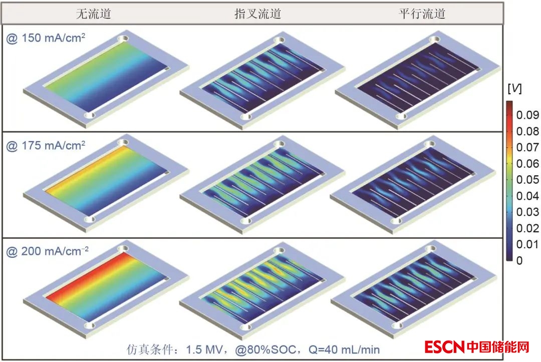 電堆結(jié)構(gòu)設(shè)計(jì)是液流電池技術(shù)開發(fā)的主要任務(wù)之一,而高功率電堆的實(shí)現(xiàn)不僅需要高性能電池材料,還需要設(shè)計(jì)開發(fā)相適應(yīng)的流場(chǎng)結(jié)構(gòu),以降低高電流密度運(yùn)行下的濃差極化電壓和高流量下的泵損耗,從而獲得最佳的能量效率與系統(tǒng)效率。對(duì)于流場(chǎng)結(jié)構(gòu)的設(shè)計(jì)與優(yōu)化,數(shù)值模擬仿真具有傳統(tǒng)實(shí)驗(yàn)手段所不具備的優(yōu)勢(shì),可以靈活模擬分析多物理場(chǎng)耦合不同流場(chǎng)結(jié)構(gòu)的關(guān)鍵變量在幾何空間內(nèi)分布特性。在國內(nèi)全釩液流電池研究初期,中科院大連化物所研究人員首先利用有限元數(shù)值分析方法,建立了二維和三維的瞬態(tài)模型,系統(tǒng)分析了液流電池內(nèi)部傳熱、傳質(zhì)、傳動(dòng)量和電化學(xué)反應(yīng)的交互作用機(jī)制。其中,Ma等在給定負(fù)半電池幾何形狀的條件下,研究了垂直和平行于外加電流截面上的速度、濃度、過電位和電流密度的分布(圖1);Zheng等研究了濃差極化的時(shí)空變化特征,設(shè)計(jì)并優(yōu)化了一種新型的塞流短流道矩形結(jié)構(gòu)電池。與此同時(shí),港科大研究團(tuán)隊(duì)提出了一系列新型流道結(jié)構(gòu)設(shè)計(jì),進(jìn)一步提升了高電密條件下液流電池的運(yùn)行效率。其中比較具有代表性的工作包括Zhang等建立的釩氧化還原液流電池流場(chǎng)設(shè)計(jì)的二維數(shù)學(xué)模型,利用該模型模擬了410 cm2單元下的交錯(cuò)通道和一系列平行蛇型通道設(shè)計(jì)。結(jié)果表明,隨著平行蛇型通道數(shù)量的增加,泵浦功率降低,釩離子分布變得不均勻,相比之下交錯(cuò)流場(chǎng)設(shè)計(jì)泵送功率最低,釩離子分布更加均勻(圖2);Wang等針對(duì)蛇型和插指型流道,通過仿真和實(shí)驗(yàn)相結(jié)合的方式系統(tǒng)地研究了比流量、流場(chǎng)尺寸對(duì)傳質(zhì)及電池性能的影響規(guī)律。結(jié)果顯示,在相同比流量下,電解液在蛇型流道電極內(nèi)的流速遠(yuǎn)大于插指型流道,所以在低比流量下蛇型流道的性能明顯好于插指型流道;增加比流量或流場(chǎng)尺寸均可提升電池的性能,由于插指型流道的臨界流量大于蛇型流道,所以插指型流道性能的提升幅度明顯大于蛇型流道,進(jìn)而導(dǎo)致兩種流場(chǎng)間的性能差異會(huì)隨著比流量和流場(chǎng)尺寸的增加逐漸減小甚至出現(xiàn)性能反轉(zhuǎn)。該工作不僅加深了對(duì)釩電池流場(chǎng)結(jié)構(gòu)及其傳質(zhì)過程的認(rèn)識(shí),也為流場(chǎng)的工程化應(yīng)用提供了依據(jù)。