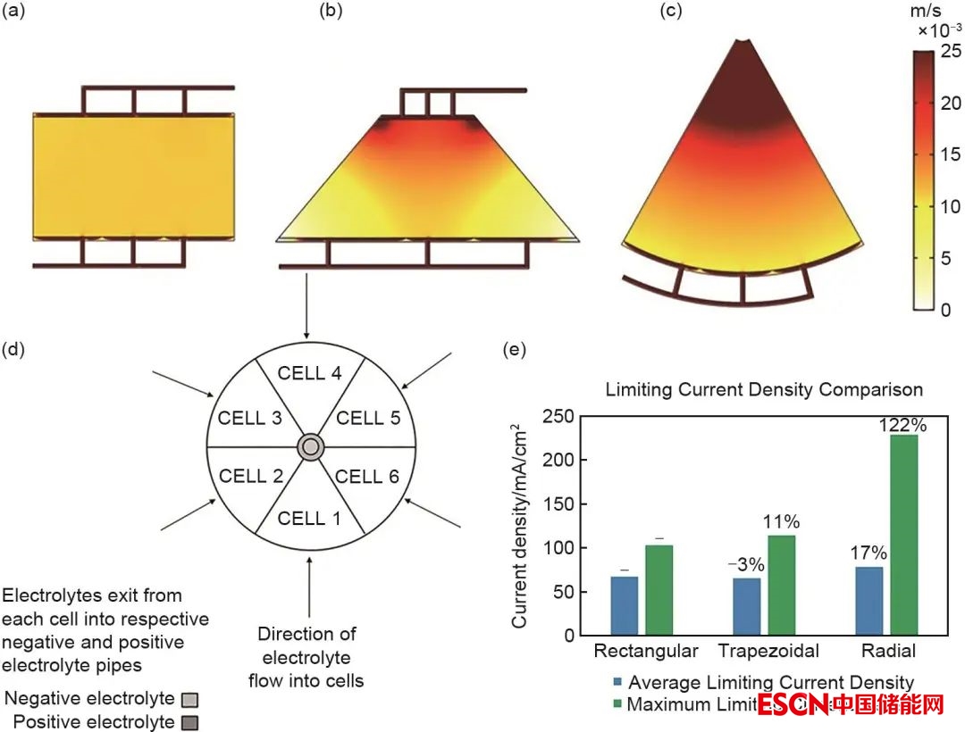圖3 (a)~(c)不同電池結(jié)構(gòu)下的速度等值線圖;(d)新型結(jié)構(gòu)液流電池概念示意圖;(e)不同幾何結(jié)構(gòu)下的平均和最大極限電流密度