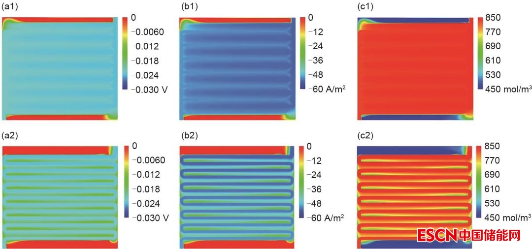 圖2 交錯(cuò)流場(chǎng)和蛇形流場(chǎng)的(a) 過電位,(b) 局域電流密度和(c) 釩濃度分布