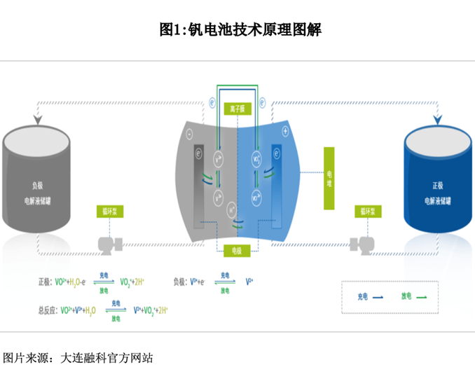 釩電池全稱是全釩氧化還原液流電池。其原理是利用釩氧化物與電極接觸發(fā)生電化學(xué)反應(yīng),使化學(xué)能轉(zhuǎn)換為電能。釩離子電解液含有化學(xué)能,釩電池儲(chǔ)能系統(tǒng)將其儲(chǔ)存在儲(chǔ)罐內(nèi),利用外接的泵,將電解液從儲(chǔ)罐壓入電池堆體內(nèi),使得電解液平行流過電極表面并發(fā)生電化學(xué)反應(yīng),從而完成釩電池儲(chǔ)能系統(tǒng)的充電或放電。