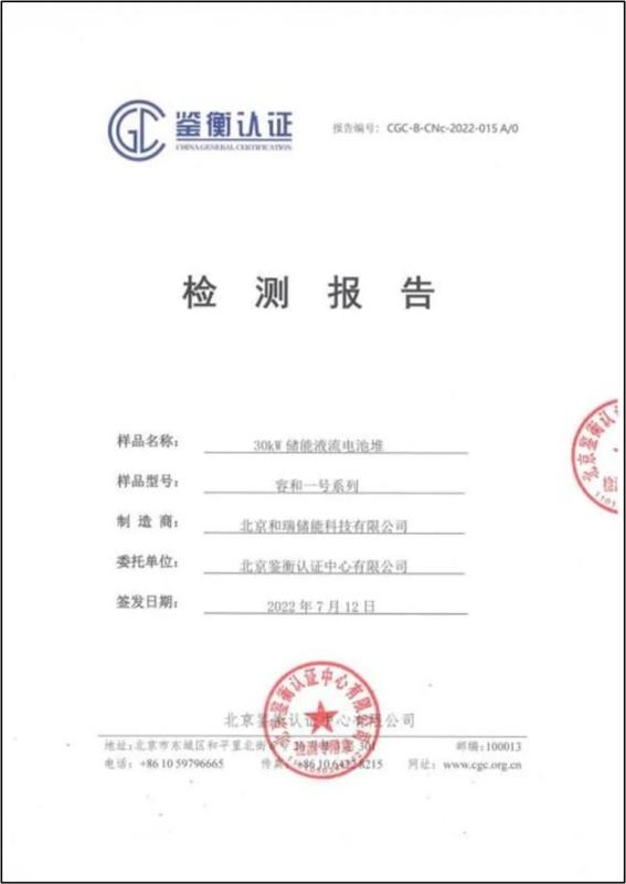 中國(guó)儲(chǔ)能網(wǎng)訊:日前,北京和瑞儲(chǔ)能科技有限公司(以下簡(jiǎn)稱“和瑞儲(chǔ)能”)“容和一號(hào)®”鐵-鉻液流電池堆順利通過第三方權(quán)威機(jī)構(gòu)北京鑒衡認(rèn)證中心(CGC)開展的產(chǎn)品檢測(cè)。