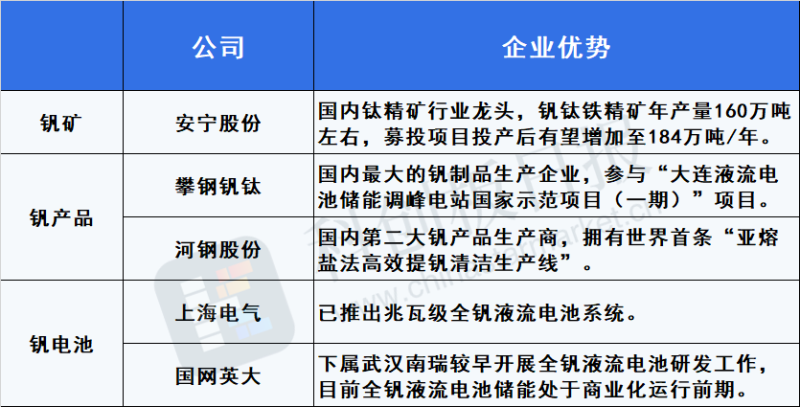 據(jù)《科創(chuàng)板日報》整理,釩儲能產業(yè)鏈中,攀鋼釩鈦在2021年與大連博融及相關子公司、參股公司簽署合作協(xié)議,將公司多釩酸銨原料加工成釩儲能介質,并全部用于恒流公司(大連博融參股公司)的“大連液流電池儲能調峰電站國家示范項目(一期)”項目中。另有這些公司受關注: