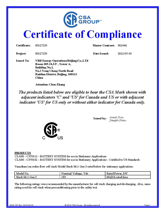 “北京普能第三代儲能產(chǎn)品中的電堆能夠順利通過測試并獲得CSA認(rèn)證證書,說明北京普能最新一代核心電堆產(chǎn)品在設(shè)計、運行與制造方面的安全性達(dá)到了國際標(biāo)準(zhǔn),這是保證釩液流電池儲能產(chǎn)品本征安全的重要基礎(chǔ),也是接下來我們用第三代儲能產(chǎn)品拓展國內(nèi)外市場的基礎(chǔ)”。北京普能總裁黃綿延博士說,“同時,通過和CSA團隊密切交流合作,北京普能對UL1973的標(biāo)準(zhǔn)也有了更深刻的理解,為我們在后續(xù)產(chǎn)品的設(shè)計制造、質(zhì)量保護、安全運行上提供了更清晰的指引”。