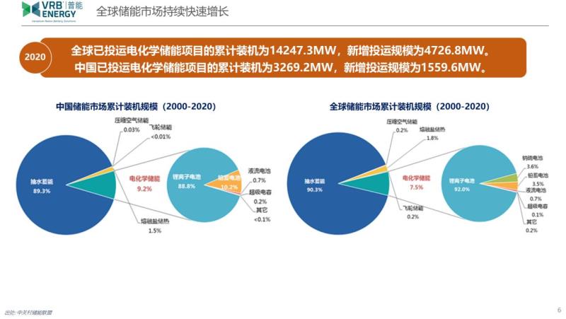 目前,全釩液流電池在儲(chǔ)能的電力市場(chǎng)上面所占的份額并不是很大。從圖上可以看到,已投運(yùn)的儲(chǔ)能項(xiàng)目現(xiàn)在還是以抽水蓄能為主。同時(shí),電化學(xué)儲(chǔ)能技術(shù)有飛速的增長(zhǎng),其中以鋰離子為主,液流儲(chǔ)能項(xiàng)目只占到0.7%。份額小并不代表技術(shù)不成熟。主要原因是容量型的市場(chǎng)前一兩年尚沒(méi)有被充分的挖掘出來(lái)。目前已經(jīng)有大量示液流儲(chǔ)能范項(xiàng)目驗(yàn)證了其成熟性,并已經(jīng)處在商業(yè)化的前端。隨著儲(chǔ)能政策的配套支持和容量型市場(chǎng)的出現(xiàn),液流電池的市場(chǎng)份額加速擴(kuò)大是肯定的。