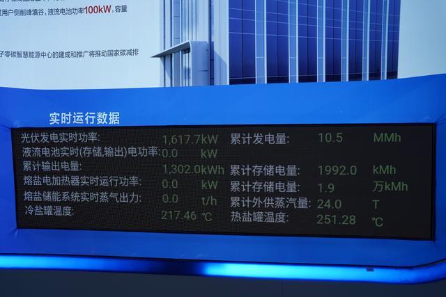 同時(shí),園區(qū)內(nèi)兩個(gè)直徑約4米、長(zhǎng)約13米的儲(chǔ)鹽罐可將電能以熱能的形式儲(chǔ)存,在需要用熱時(shí)提供蒸汽熱源。目前,兩個(gè)儲(chǔ)鹽罐的總儲(chǔ)熱達(dá)100吉焦,年供蒸汽超過(guò)10000噸,熱電聯(lián)供效率可達(dá)90%。此外,園區(qū)內(nèi)還裝有一個(gè)集成箱式全釩液流電池,該液流電池通過(guò)儲(chǔ)存光伏或低谷電能并在用電高峰時(shí)釋放,幫助電網(wǎng)實(shí)現(xiàn)柔性“削峰填谷”。