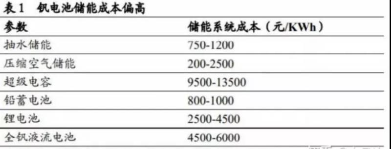 成本是制約釩電池發(fā)展的核心原因。根據(jù)《儲(chǔ)能產(chǎn)業(yè)研究白皮書》統(tǒng)計(jì),全釩液流電池(釩電池)每千瓦投資成本在4500-6000元,而抽水儲(chǔ)能的每千瓦投資成本在750~1200元、鋰電池每千瓦成本在2000~3000元左右,高成本使得釩電池在儲(chǔ)能領(lǐng)域的應(yīng)用并不廣泛。