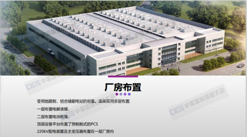 這張圖是這個(gè)電站的效果圖,實(shí)際建設(shè)的情況和它也相差不多,受到用地限制,因?yàn)槭浅鞘兄行碾娬荆玫厥钦鞯貋淼?。所以我們采用了多層布置,一層布置電解液的液罐,二層布置液堆,在頂層設(shè)計(jì)了一個(gè)高的高鐵臺,用來布置PCS的集裝箱預(yù)制艙。220KV配電裝置和變壓器布置在一層廠房內(nèi),實(shí)現(xiàn)了和周邊環(huán)境的一致性。
