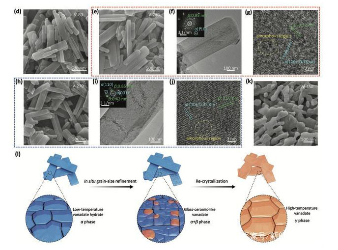 根據(jù)釩酸鹽材料前驅(qū)體材料在熱處理過(guò)程中的這一特性,可以通過(guò)控制加熱溫度的方式對(duì)材料的結(jié)構(gòu)進(jìn)行調(diào)控,作者分別采用三種溫度對(duì)其進(jìn)行了處理:1)V-80是在80℃下進(jìn)行2h地處理;2)V-270時(shí)在270℃下處理2h;3)V-450是在450℃下進(jìn)行2h處理。