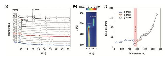 在材料的晶體結(jié)構(gòu)隨著溫度發(fā)生變化的同時(shí),我們可以看到特征峰的寬度也在變寬,這可能是由于晶體顆粒直徑變化引起的,或者是由于晶體結(jié)構(gòu)內(nèi)部的缺陷導(dǎo)致的,作者通過(guò)Scherrer公式進(jìn)行計(jì)算表明晶體顆粒的尺寸是引起衍射峰變寬的主要因素。從下圖c的計(jì)算結(jié)果可以看到在270℃左右發(fā)生相轉(zhuǎn)變時(shí)材料的晶粒尺寸會(huì)出現(xiàn)明顯的降低,當(dāng)從常溫升高到250℃時(shí),材料的晶粒尺寸從約20nm升高到了35nm,但是溫度達(dá)到260-270℃,材料從α相轉(zhuǎn)變?yōu)棣孪嗟倪^(guò)程中,α相晶粒的尺寸降低到了13nm,在270℃時(shí)β相的晶粒尺寸最低降低到了11nm,但是隨后隨著溫度的升高,則會(huì)導(dǎo)致材料的晶粒尺寸繼續(xù)升高。