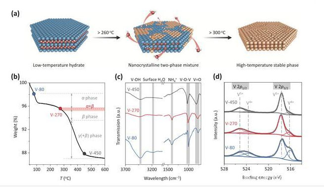 實(shí)驗(yàn)中釩酸鹽正極前驅(qū)體材料是通過(guò)兩步水熱法合成,首先將釩酸銨(NH4VO3)與草酸二水化合物(H2C2O4·2H2O)在160℃下水熱反應(yīng)12h,然后再向其中加入LiOH,在180℃下反應(yīng)12h,通過(guò)上述的兩步法獲得前驅(qū)體材料還含有大量的自由水,然后在不同的溫度下進(jìn)行熱處理(如下圖所示),通過(guò)熱重分析(下圖b)可以看到材料在120℃以下會(huì)出現(xiàn)快速的重量損失,主要是材料中的物理吸附水的大量損失,隨后在加熱到250℃這一范圍內(nèi)材料發(fā)生了輕微的重量損失,隨后繼續(xù)升高溫度則開始出現(xiàn)快速的重量損失,這表明材料中結(jié)合的-OH或-NH4發(fā)生分解。