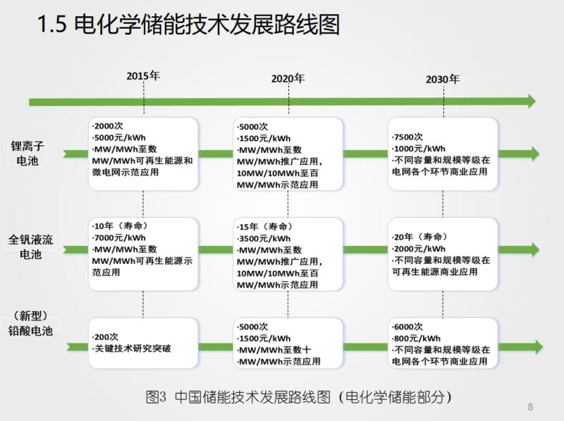 這個(gè)可能大家也比較熟悉,這是2016年的數(shù)據(jù),就是我們儲(chǔ)能裝機(jī)容量的比例圖,我們電化學(xué)儲(chǔ)能現(xiàn)在蓬勃的發(fā)展,但是在2016年的時(shí)候依然只有3%,但是它發(fā)展的很快,可以看到下面的柱狀圖,2012年的時(shí)候它的電化學(xué)裝機(jī)容量規(guī)模是在接近600兆瓦的裝機(jī)規(guī)模,到2018年到了3600兆瓦,已經(jīng)翻了六番。為什么它可以發(fā)展這么快?我想可能有三點(diǎn)原因:第一點(diǎn),它的成本下降非???,可能剛才王主任也說到了,鋰電池的成本,2020年我看圖上面寫到成本大概是在1.1元/瓦時(shí),這樣其實(shí)在幾年以前還是非常貴,可能3元左右人民幣,所以說成本的下降推動(dòng)了它的蓬勃發(fā)展。第二點(diǎn),電化學(xué)電池是不受到地域的限制的,比如說抽水蓄能或者是其他的方式,可能需要有水,所以說電化學(xué)可能會(huì)不受地域的限制。第三點(diǎn),能量轉(zhuǎn)換效率很高,鋰電池差不多在90%以上,我的液流電池現(xiàn)在比較成熟的產(chǎn)品效率是在80%左右。這個(gè)是我們中國的儲(chǔ)能發(fā)展技術(shù)路線圖,我們可以大概看一下,我們國家給它從2015、2020年、2030年制定的不同的發(fā)展方向。