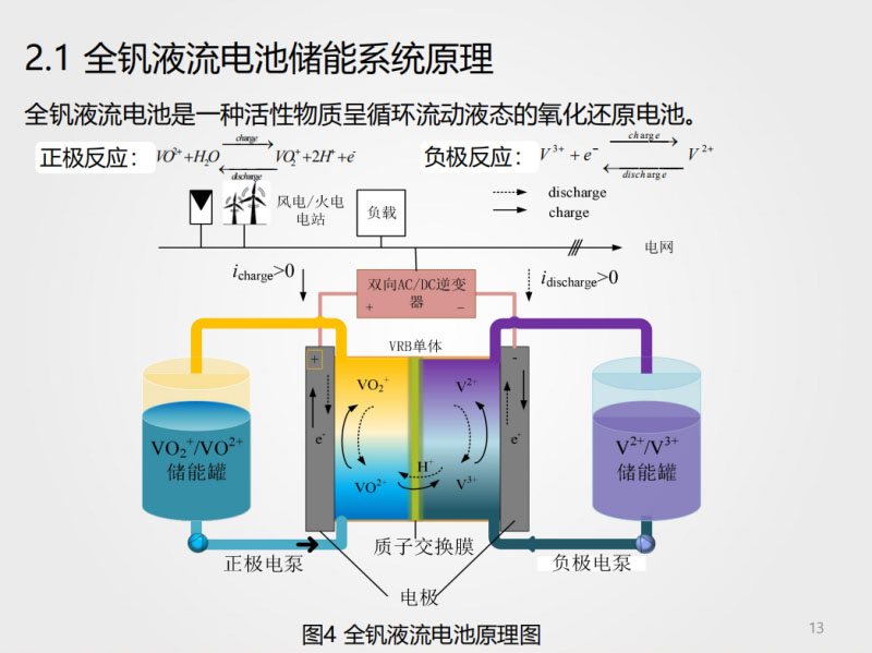 圖四就是全釩液流電池的原理圖,也是比較比較抽象的原理圖,肯定不是實(shí)際的。有四部分組成,首先我們要有電解液,第二個(gè)就是我要有電堆,電堆是它發(fā)生化學(xué)反應(yīng)的地方,這是它的一個(gè)核心。第三個(gè),它有兩個(gè)儲(chǔ)能罐,還要有兩個(gè)電泵,這兩個(gè)電泵就是儲(chǔ)能罐里的電解液,它的正極是釩的四價(jià)跟五價(jià)組成的,負(fù)極是釩的二價(jià)和三價(jià)組成的,可能大家覺得這個(gè)圖為什么是花花綠的,實(shí)際上不同的釩的二、三、四、五價(jià)是不一樣的,所以畫成這樣子了。