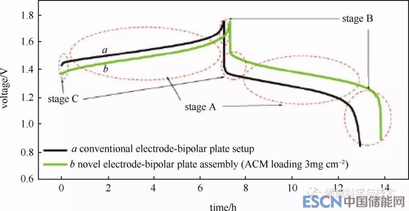 圖8 傳統(tǒng)電極/雙極板和一體化電極/雙極板在40 mA/cm2電密下充放電性能
