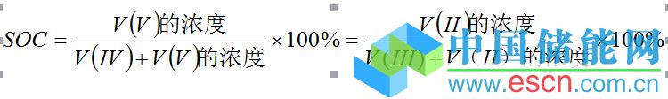 全釩氧化還原液流電池是用V(Ⅱ)/V(Ⅲ)和V(Ⅳ)/V(Ⅴ)氧化還原電對的硫酸溶液分別作正負半電池電解液的。完全放電態(tài)(即SOC=0):正半電池電解液為V(Ⅳ)的硫酸溶液,負半電池電解液為V(Ⅲ)的硫酸溶液;完全充電態(tài)(即SOC=1):正半電池電解液為V(Ⅴ)的硫酸溶液,負半電池電解液為V(Ⅱ)的硫酸溶液;其余的電荷狀態(tài)(即0<SOC<1),則正半電池為V(Ⅳ)和V(Ⅴ)的混合硫酸溶液,負半電池為V(Ⅱ)和V(Ⅲ)的混合硫酸溶液,依電荷狀態(tài)的不同,混合溶液中各自的比例不同。電荷狀態(tài)的計算見公式: