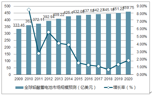 鉛酸蓄電池作為全球市場份額最大的電池類型, 全球市場規(guī)模預計仍將保持持續(xù)增長。2015 年全球鉛酸蓄電池市場規(guī)模較上年增長 1.57%,達到 432.08 億美元,預計未來 5 年將基本維持 1%-2%增長速度。