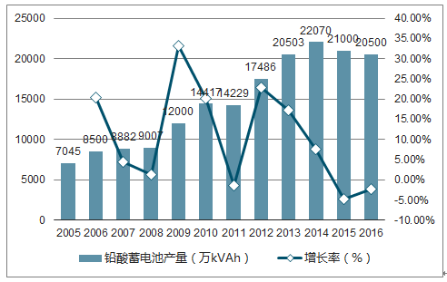 我國是全球最大的鉛酸蓄電池生產國、消費國和出口大國。我國鉛酸蓄電池行業(yè)主要實行以銷定產, 鉛酸蓄電池生產數(shù)量減去出口的數(shù)量大致為國內消費數(shù)量。從 2005 年至 2016 年,國內企業(yè)鉛酸蓄電池產量呈波動式增長,年均復合增長率達 10.17%。