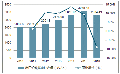 在“十三五”期間鉛酸蓄電池產量預計復合增長率為 10.76%,至 2020 年鉛酸蓄電池產量達到 35,000 萬 kVAh。近年來,通過行業(yè)持續(xù)的技術引進、消化、吸收和歐、美、日、韓等國家在我國的投資建廠,我國鉛酸蓄電池主要類產品的制造技術已經接近國際先進水平。目前,我國已成為全球鉛酸蓄電池生產、消費和出口大國。近年來,我國出口鉛酸蓄電池產量保持較快速度增長,2015 年出口產量為 3,078.48 萬 kVAh,同比增長 9.44%,2016 年出口產量下滑產量為 2,804.49 萬 kVAh,同比下降 8.90%。
