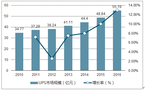 UPS 電源是 UninterruptablePowerSupply 的英文縮寫,即不間斷電源,作為一種具有儲能裝置的電子交流變換系統(tǒng),其基本功能是在中斷供電時,能不間斷供電,始終向負載提供高質量的交流電源,達到穩(wěn)壓、穩(wěn)頻、抑制浪涌、尖峰、電噪音、補償電壓下陷、長期低壓等因素干擾。UPS 電源系統(tǒng)按其應用領域可分為信息設備用 UPS 電源系統(tǒng)和工業(yè)動力用UPS 電源系統(tǒng)二個大類別。信息設備用 UPS 電源系統(tǒng)主要應用于:信息產業(yè)、IT行業(yè)、交通、金融行業(yè)、航空航天工業(yè)等計算機信息系統(tǒng)、通訊系統(tǒng)、數(shù)據(jù)網絡中心等的安全保護問題,其作為計算機信息系統(tǒng)、通訊系統(tǒng)、數(shù)據(jù)網絡中心等的重要外設,在保護計算機數(shù)據(jù)、保證電網電壓和頻率的穩(wěn)定,改進電網質量,防止瞬時停電和事故停電對用戶造成的危害起到重要的作用。 工業(yè)動力用 UPS 電源系統(tǒng)主要應用于:工業(yè)動力設備行業(yè)電力、鋼鐵、有色金屬、煤炭、石油化工、建筑、醫(yī)藥、汽車、食品、軍事等領域,其作為電力自動化工業(yè)系統(tǒng)設備、遠方執(zhí)行系統(tǒng)設備、高壓斷路器的分合閘、繼電保護、自動裝置、信號裝置等的交、直流不間斷電源設備,質量直接關系到電網的安全運行,是發(fā)電設備和輸變電設備的“心臟”。2016 年我國 UPS 市場規(guī)模預計為 55.19 億元,未來市場將保持較快的增長速度。