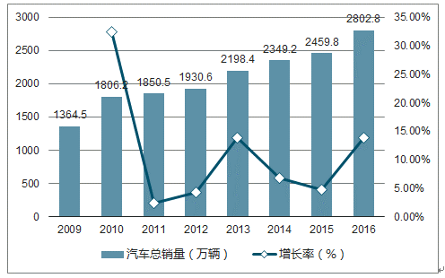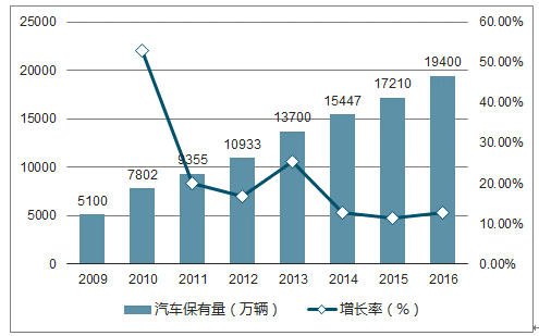汽車起動電池下游市場分為一級市場(配套市場)與二級市場(維護市場),在汽車產銷量和保有量持續(xù)增長的背景下, 汽車起動電池市場規(guī)模呈現(xiàn)快速增長態(tài)勢。一級市場是為汽車整車生產廠家提供配套供貨,每輛新車一般配備一只電池。二級市場是指存量車客戶在車輛維修保養(yǎng)過程中通過汽車零配件經銷商、汽車 4S 店、蓄電池經營部和汽車修理店等經銷商購買蓄電池。汽車起動電池屬于汽車零部件中的消耗品,平均壽命約 2 年,因此汽車起動電池市場需求數(shù)量為新車銷量與汽車保有量一半之和。我國汽車銷量從2010年的1,806.2萬輛增長至2016年的2,802.8萬輛,年均增長率為7.60%;我國汽車保有量從 2010 年 7,802 萬輛增長至 2016 年的 19,400 萬輛,年均增長率達 16.39%。持續(xù)增長的汽車銷和存量為汽車起動電池的發(fā)展提供了良好的市場環(huán)境。