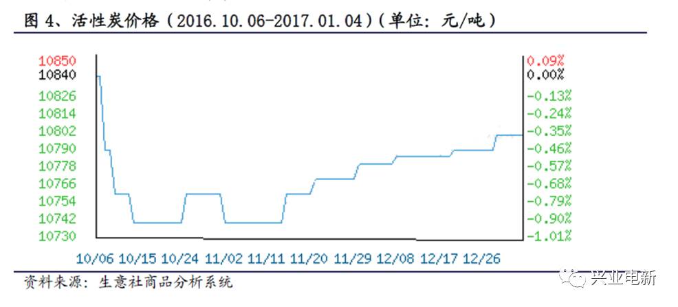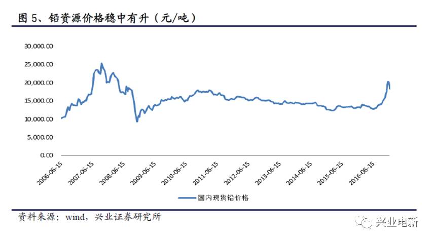 從圖4中可以看到,2016年下半年,活性炭價格先有一個明顯下跌,之后緩慢回升。此系列的上一篇報告中分析可以知道,近些年來鉛資源的價格大體呈先較為穩(wěn)定的狀態(tài),但在近半年價格有一定幅度的提升,具體走勢圖見圖5。