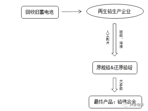 再生鉛的生產(chǎn)流程大致如下:回收使用過的蓄電池,進入再生鉛生產(chǎn)企業(yè)。經(jīng)過人工剝片、破碎以及熔煉等步驟,得到還原粗鉛和還原鉛錠,最后大多加工成鉛銻合金。