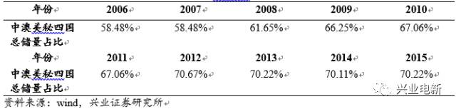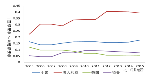 表1、中國、澳大利亞、美國和秘魯四國鉛總儲量占全球鉛儲量比例情況表