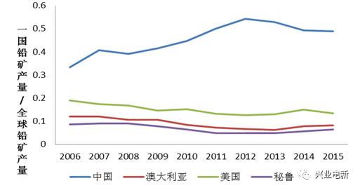 圖3顯示了全球鉛礦的大致分布圖。結(jié)合圖4、圖5以及表1可以發(fā)現(xiàn):澳大利亞、中國、美國和秘魯是當今世界上鉛儲量比較豐富的四個主要國家,從2006年到2015年,四國鉛總儲量占全球儲量的比例從58.48%逐步上升至70.22%。中國不僅含有位列世界第二的鉛儲量,國內(nèi)鉛產(chǎn)量占全球產(chǎn)量的比例更是在2015年時高達48.83%。