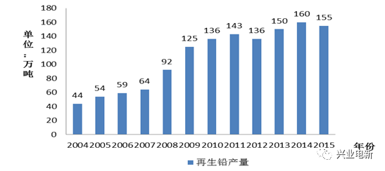 圖6和圖7可以看出,在2014年和2015年,我國鉛礦原生鉛的產(chǎn)量有了小幅的下降,但國內(nèi)再生鉛的產(chǎn)量卻在近些年來穩(wěn)步上升,在2014年達到近160萬噸。