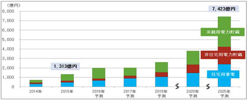 其他市場方面,預(yù)計住宅用蓄電系統(tǒng)用途的市場規(guī)模2025年將由2015年的478億日元擴大至5倍的2407億日元。