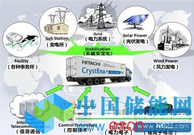 集裝箱式蓄電系統(tǒng)“CrystEna”的使用示意圖(出處:日立制作所)