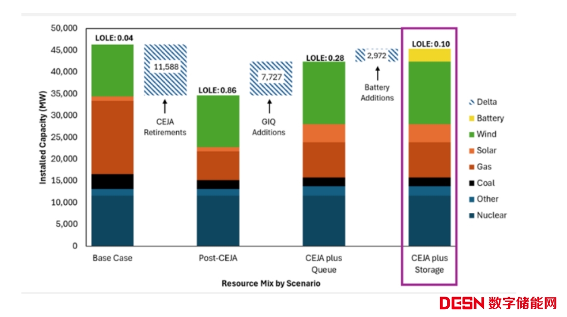研究表明(如下圖所示),盡管基本情況顯示出4971MW容量盈余,但CEJA后和CEJA+隊(duì)列的情景中都出現(xiàn)了容量短缺情況,分別短缺5065MW和2213MW。