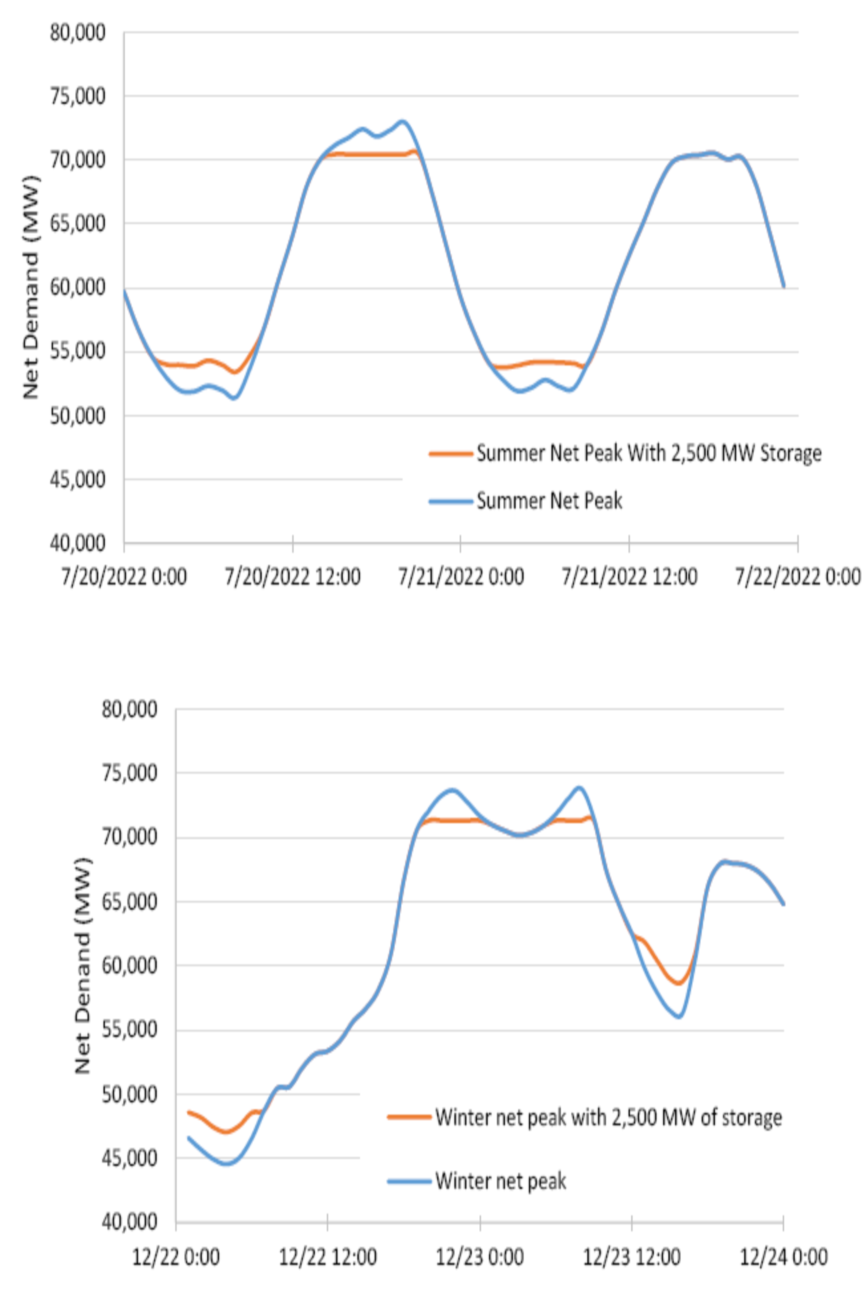 圖11.如果在ERCOT公司服務(wù)區(qū)域中增加2500MW的儲能系統(tǒng),將擴(kuò)大夏季的凈負(fù)荷峰值(上圖),但時間更長的峰值期間可以通過更多的太陽能發(fā)電量來抵消。冬季電力需求峰值期間(下圖)的影響主要是在夜間,這是太陽能發(fā)電無法抵消的。這將需要長時儲能系統(tǒng)來提供更多的容量。