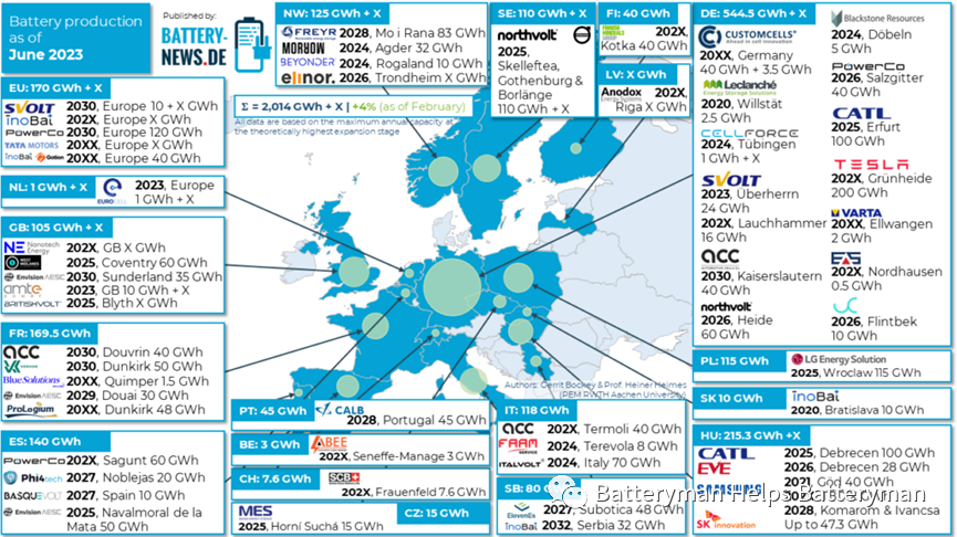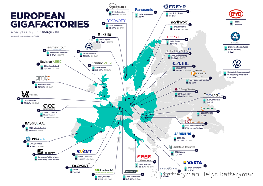 德國(guó)、瑞典、挪威、匈牙利和波蘭等國(guó)已經(jīng)率先啟動(dòng)并開(kāi)發(fā)了這些首批項(xiàng)目,這要?dú)w功于CATL、Northvolt、SK Innovation或LG化學(xué)等其他領(lǐng)先企業(yè)在這些國(guó)家宣布的項(xiàng)目。此外,大眾汽車(chē)等大型原始設(shè)備制造商最近也宣布計(jì)劃在未來(lái)幾年內(nèi)在歐洲開(kāi)設(shè)多達(dá)6家千兆工廠(chǎng)。
