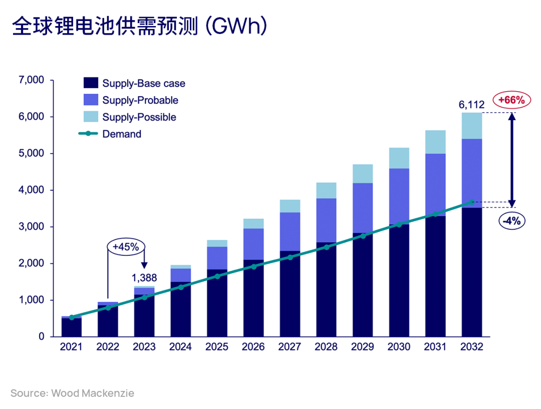 伍德麥肯茲最新預(yù)測(cè)數(shù)據(jù)顯示,2023年,全球鋰電池產(chǎn)量有望增長(zhǎng)45%,超過1380GWh,而需求約為1080GWh。根據(jù)電池供應(yīng)商公布的擴(kuò)產(chǎn)項(xiàng)目,2032年,鋰電池產(chǎn)量可能高達(dá)6100GWh,但由于當(dāng)年需求前景約為3700GWh,因此,項(xiàng)目取消的可能性很大。