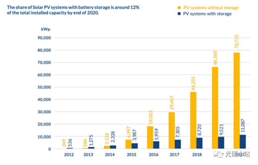 以黎巴嫩為例,其光伏配儲(chǔ)率隨著其光儲(chǔ)系統(tǒng)價(jià)格的下降而不斷上升,2020年黎巴嫩的光伏配儲(chǔ)率達(dá)到了12%,共有11,087kWp光伏配備了儲(chǔ)能系統(tǒng)。