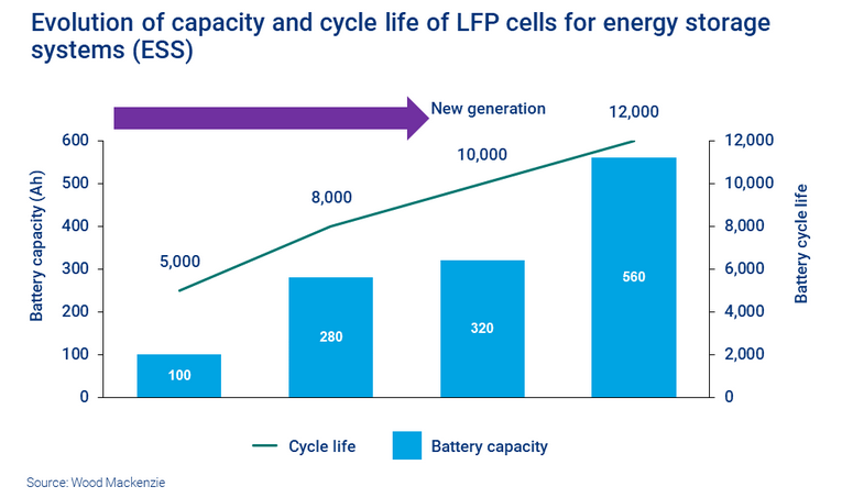 280Ah已經成為電網(wǎng)規(guī)模應用中磷酸鐵鋰電池(LFP)的新標準,其容量可以達到560Ah,充放電次數(shù)更高,可達12,000次。然而,尺寸更大的電池需要更高的制造能力,也意味著安全管理。