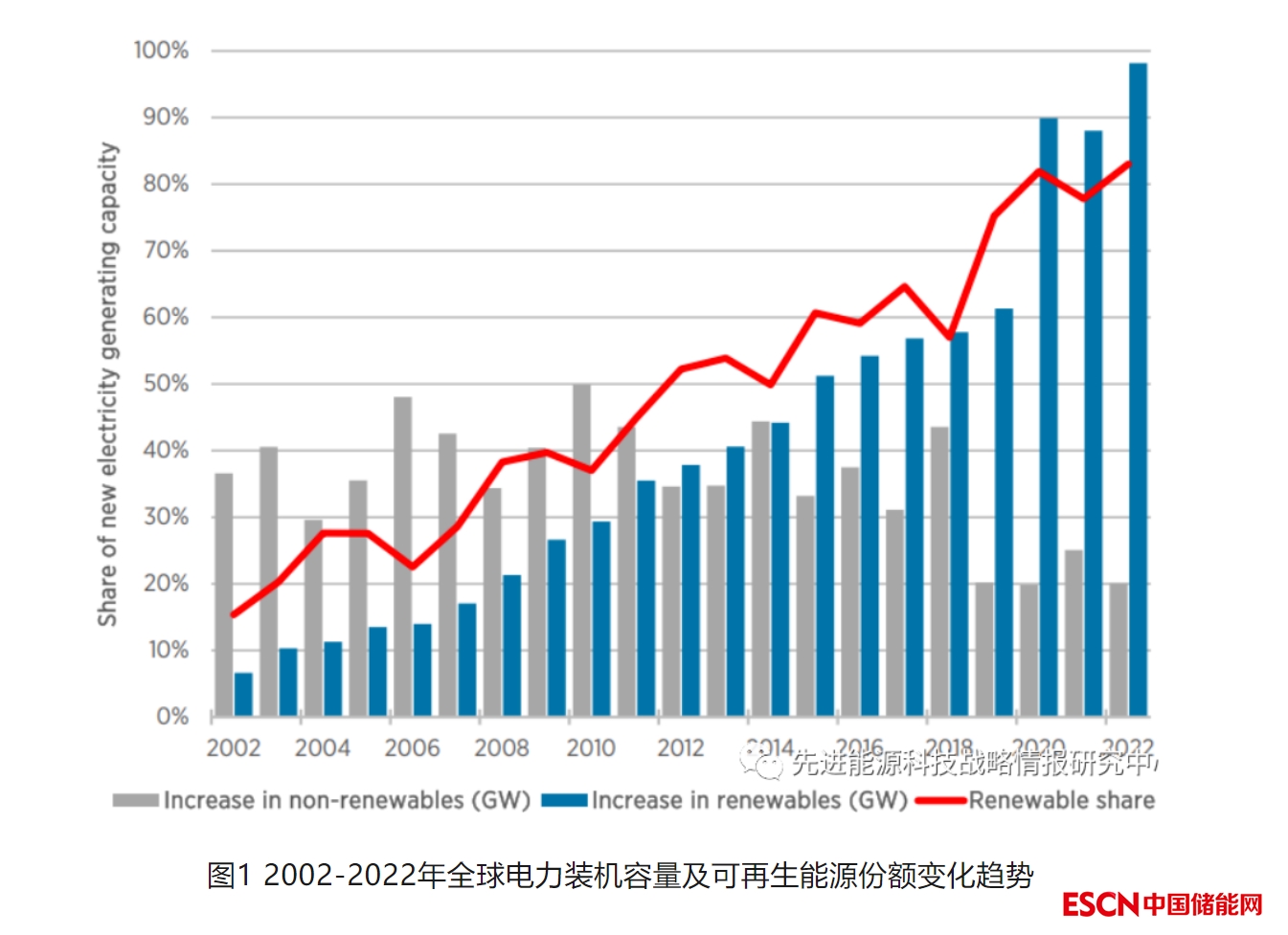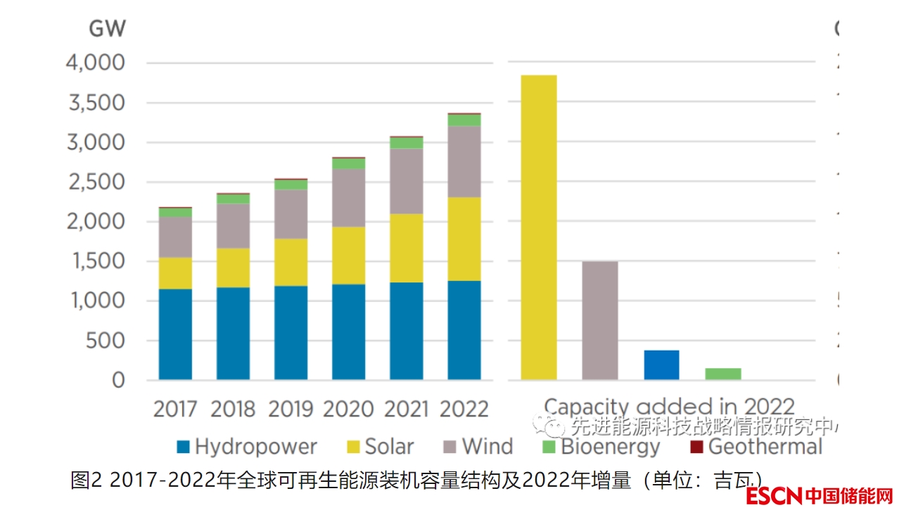 截至2022年底,全球可再生能源發(fā)電裝機(jī)總量達(dá)到3372吉瓦,較上一年增加295吉瓦,增幅達(dá)9.6%。其中,2022年全年新增發(fā)電裝機(jī)容量的83%來自可再生能源,高于2021年的78%,可再生能源占發(fā)電裝機(jī)總量的比例由2021年的38.3%增長至40.2%,如圖1所示。