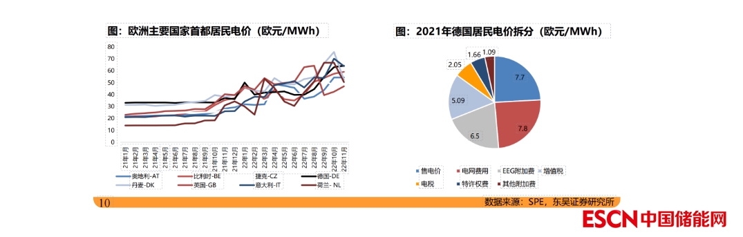 居民電價的上漲原因是售電價格的提高,德國通過減免稅費以減輕居民負擔。以德國為例,德國居民電價由售電價格、電網(wǎng)費用、EEG附加費、電稅等費用加總得出。2022年批發(fā)電價的上漲,推動了居民電價合約價格的提高,2022年11月德國居民電價已達64.19元/MWh。此外,德國已于2022年7月取消EEG附加費,歐洲各國后續(xù)仍有可能逐漸減免或取消相關(guān)稅費,減輕居民端用電負擔。