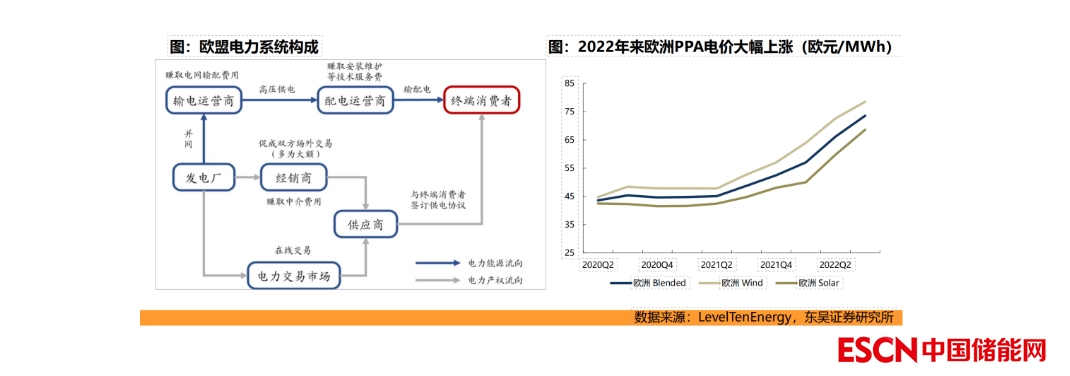 發(fā)電廠的電力一部分通過PPA電價售出。發(fā)電廠通過購電協(xié)議(PPA) 鎖量鎖價的形式與下游能源供應(yīng)商簽署10-20年的電力供應(yīng)合約。2022年因歐洲能源緊缺、批發(fā)電價大幅上漲,PPA電價也呈現(xiàn)出上漲趨勢,2022Q3平均光伏PPA電價為68.6歐元/MWh,同環(huán)增53.1%/14.7%,平均風電PPA電價為73.5歐元/MWh,同環(huán)增50.9%/11.1%,能源危機下,電力發(fā)電廠收益顯著提升,加大新能源開發(fā)力度。