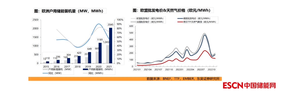 2022年歐洲能源危機、電價高漲,歐洲戶儲需求旺盛。2022年受俄烏沖突影響,俄羅斯天然氣供應(yīng)大幅減少,導(dǎo)致歐洲能源價格飆升,進而推動歐洲批發(fā)電價一路上漲,歐盟月均批發(fā)電價最高點超400歐元/MWh,較21年同期增長達346%。在此導(dǎo)火索下,歐洲戶用光儲高經(jīng)濟性得到市場的認可,光儲需求開啟爆發(fā)式增長,我們預(yù)計2022年歐洲光伏達50GW以上,實現(xiàn)翻倍增長,歐洲儲能達13GWh左右,同增三倍。