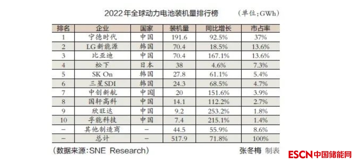 在2022年全球動力電池裝機量十強榜單中,中國企業(yè)占6席,韓國企業(yè)占3席,日本企業(yè)占1席。從市占率來看,2021年裝機量十強榜單中,中日韓電池廠商所占市場份額分別為48.2%、12%和30.2%;2022年的十強榜單中,中國電池廠商的市場份額增至60.4%,日、韓電池廠商分別降至7.3%和23.7%。如果再加上其他不在十強榜單之內(nèi)的中國電池廠商,2022年中國動力電池企業(yè)的裝機量已占到全球的2/3,占比近七成。另外,十強之外廠商的市場份額從2021年的9.5%下滑至8.6%,行業(yè)呈現(xiàn)“強者恒強、弱者愈弱”的趨勢。