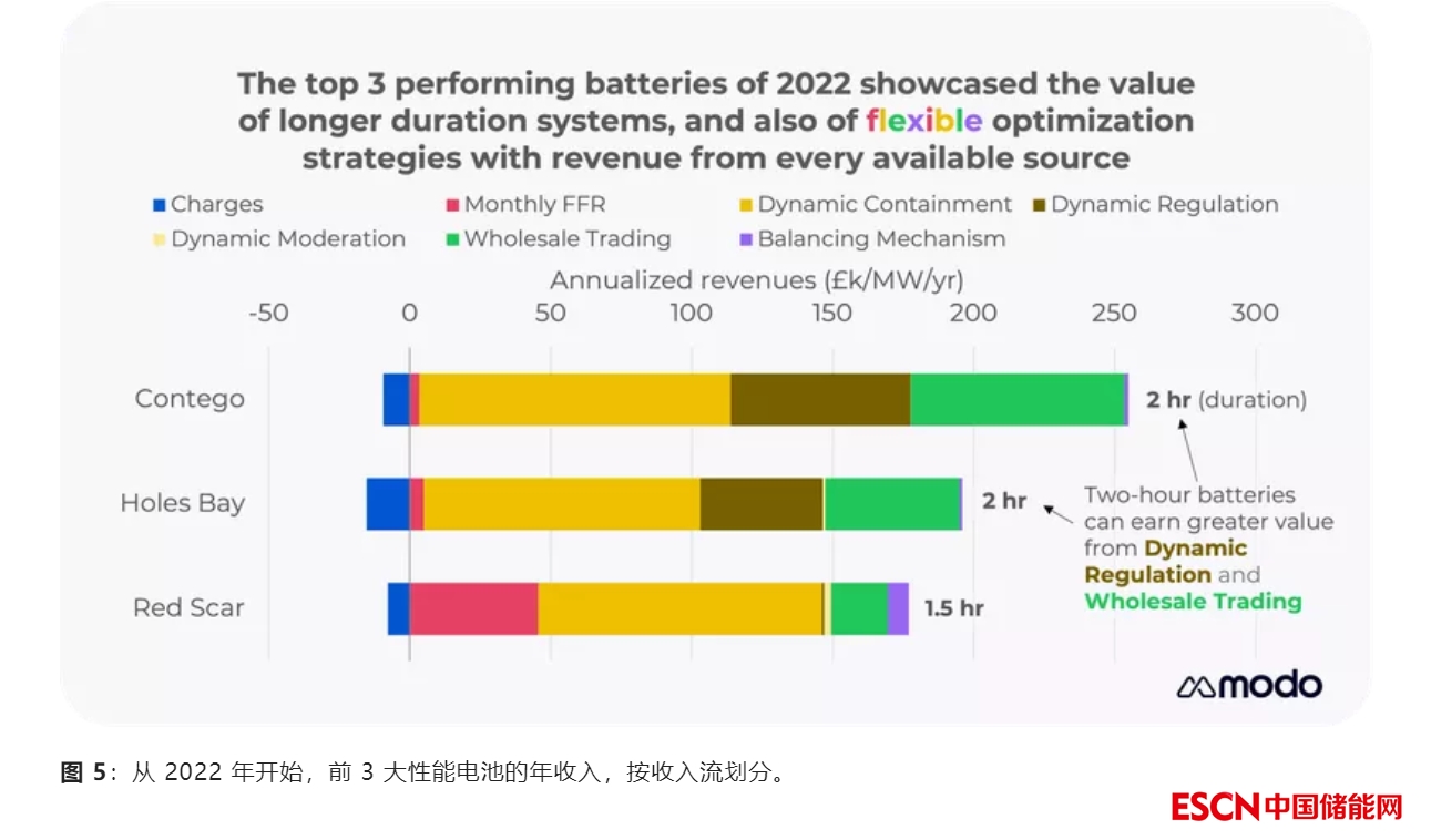 圖 5 顯示了這三組電池儲(chǔ)能電站資產(chǎn)在 2022 年的收入明細(xì)情況。