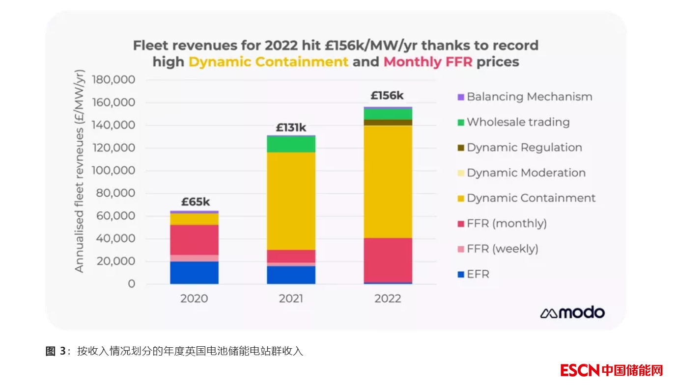 電池儲(chǔ)能電站群的收入相比2021 年增長了 19%,達(dá)到 156,000 英鎊/MW。其中的兩大貢獻(xiàn)者是頻率響應(yīng)的合同收益,特別是Dynamic Containment【2】(占總收入的 63%)和月度 FFR(占總收入的 25%)【2】。