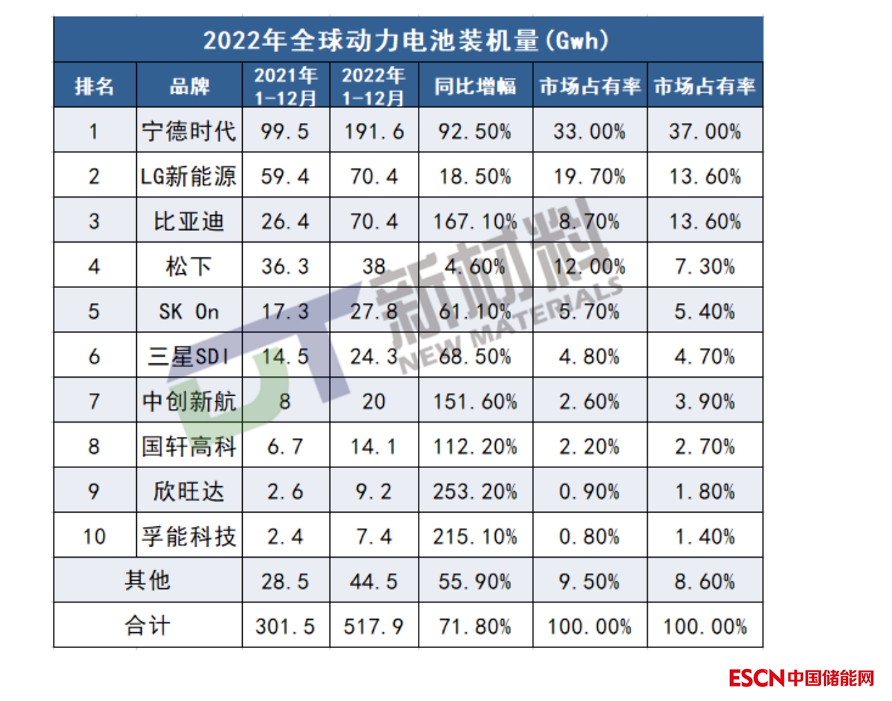 比亞迪以70.4Gwh的裝機(jī)量以及167.10%的超高增速,超越松下成為了此次榜單的第三,市占率達(dá)到與LG新能源相同的13.60%,按照該增速,預(yù)計(jì)23年將完成趕超。