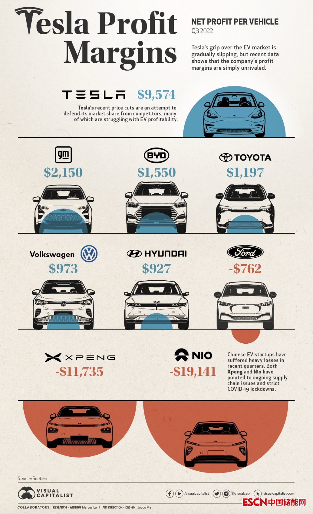 路透社最近匯編的數(shù)據(jù)顯示,特斯拉的毛利潤和凈利潤都明顯高于競爭對(duì)手。特斯拉每賣一輛車的凈利潤為9574美元,遠(yuǎn)遠(yuǎn)高于其他品牌的汽車。中國電動(dòng)汽車初創(chuàng)公司Xpeng和Nio,兩家公司都報(bào)告了1月份的銷售額同比下降,凈利潤微乎其微,這意味著它們不太可能與特斯拉的降價(jià)相競爭。