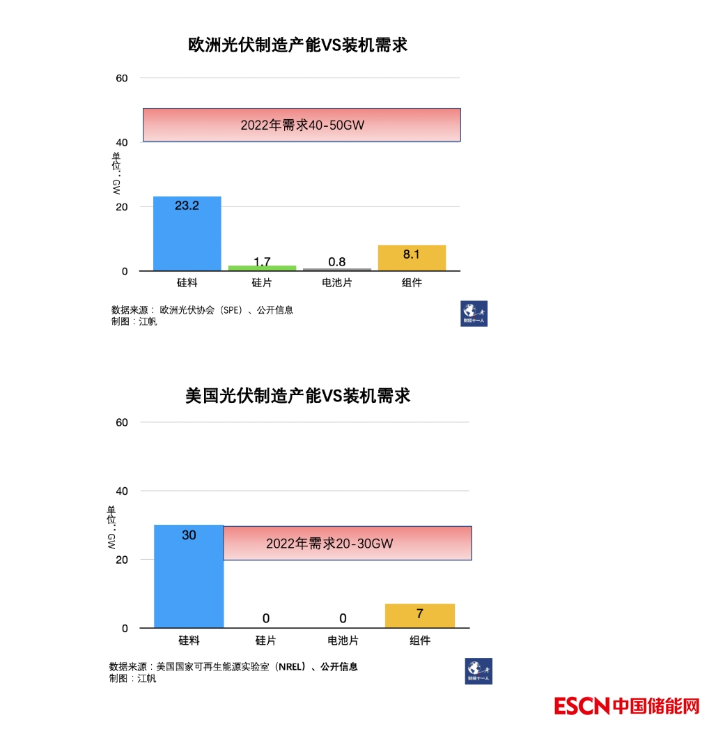 參照歐美2021年的實(shí)際裝機(jī)和裝機(jī)預(yù)期,其各自提出的本土制造能力目標(biāo)并不能完全匹配需求。也就是說,歐美尋求光伏制造能力一定程度的戰(zhàn)略自主,完全脫離中國光伏不現(xiàn)實(shí)。