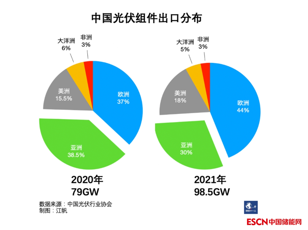 歐洲是中國光伏組件最重要的出口地,2021年占據(jù)了44%的份額。根據(jù)PV InfoLink數(shù)據(jù),2022年1月-5月,中國光伏組件共出口63GW,同比增長102%,其中歐洲增速145%,占比已超一半。