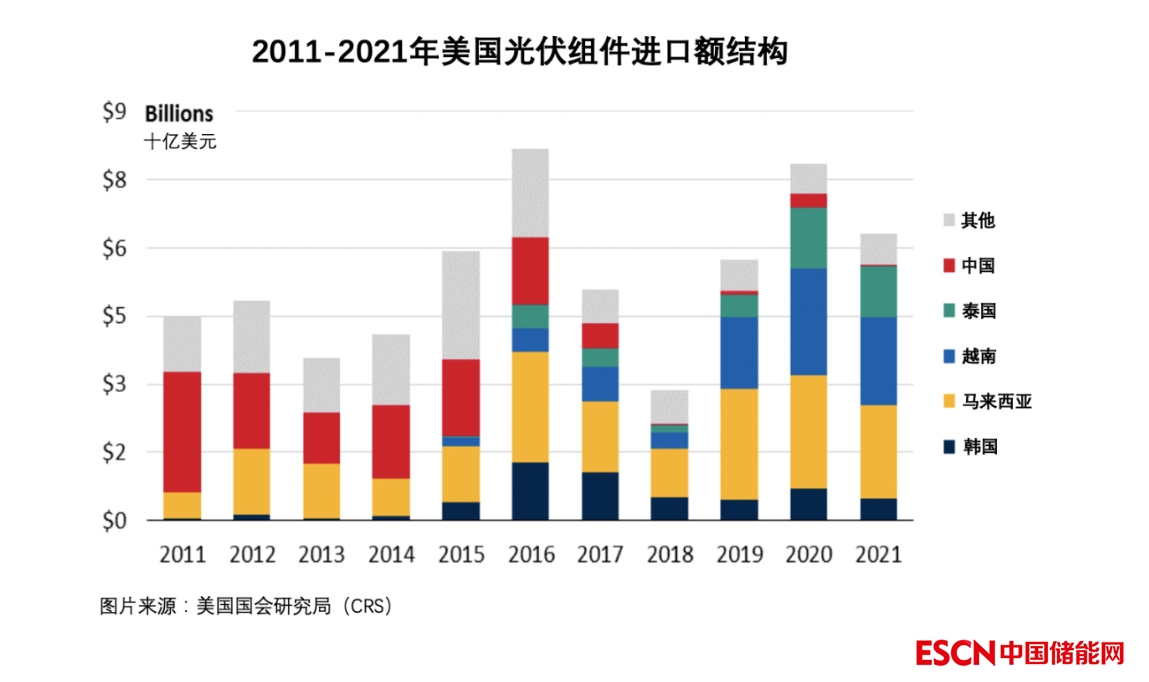 2011年—2020年,美國直接從中國進(jìn)口的光伏產(chǎn)品金額減少了86%。作為中國光伏企業(yè)海外產(chǎn)能主要集聚地的東南亞,眼下占據(jù)美國光伏組件八成以上份額。